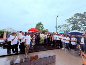 Puluhan peserta napak tilas, mengenakan kaus putih dan biru bertuliskan logo UHN serta topi dengan tulisan “UHN”, berkumpul di kompleks makam dengan khidmat. Hujan yang membasahi halaman tidak menyurutkan semangat untuk menghormati jasa sang perintis. Beberapa peserta mengenakan kaus hitam dengan gambar Nommensen dan tulisan “Universitas HKBP Nommensen”, menunjukkan kebanggaan mereka sebagai bagian dari keluarga besar UHN.