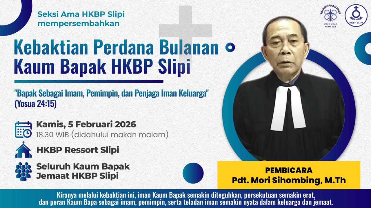 Pada hari Kamis, 5 Pebruari 2026, Punguan Ama HKBP Slipi untuk pertama kalinya menyelenggarakan kegiatan Penelaahan Alkitab (PA) khusus bagi kaum bapak. Tonggak bersejarah ini menjadi awal dari program pembinaan rohani yang diharapkan akan terus berlanjut secara rutin, dan untuk PA perdana ini dipercayakan kepada Pdt. Mori Sihombing, MTh sebagai pembicara. Kegiatan berlangsung penuh semangat dan menghadirkan bahan refleksi yang sangat relevan bagi kehidupan bergereja dan berkeluarga di masa kini.